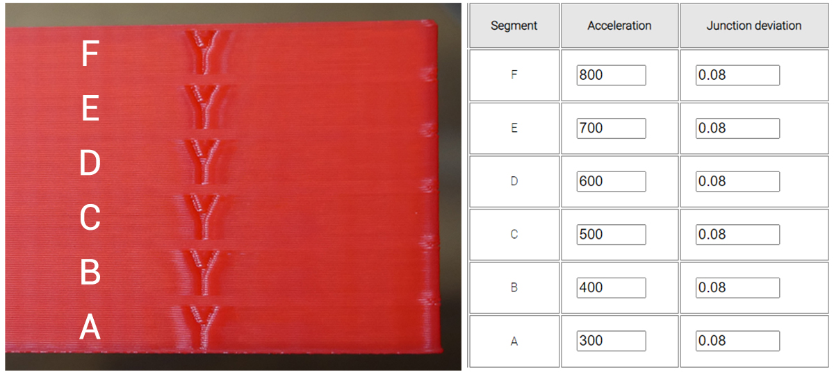 Inspect your finished print. Hopefully there will be a clear difference between the segments that reflect the acceleration values you entered. In the example below (Ender 3 direct drive, PLA, linear advance enabled), acceleration varied from 300 to 800 in 100 mm/sec/sec increments. Junction deviation was left at the default 0.08. The difference between each segment is subtle, but there is increased ghosting around the letter Y on the higher segments. The previous value was 500, but a small increase in quality may be achieved from lowering the value to 400.