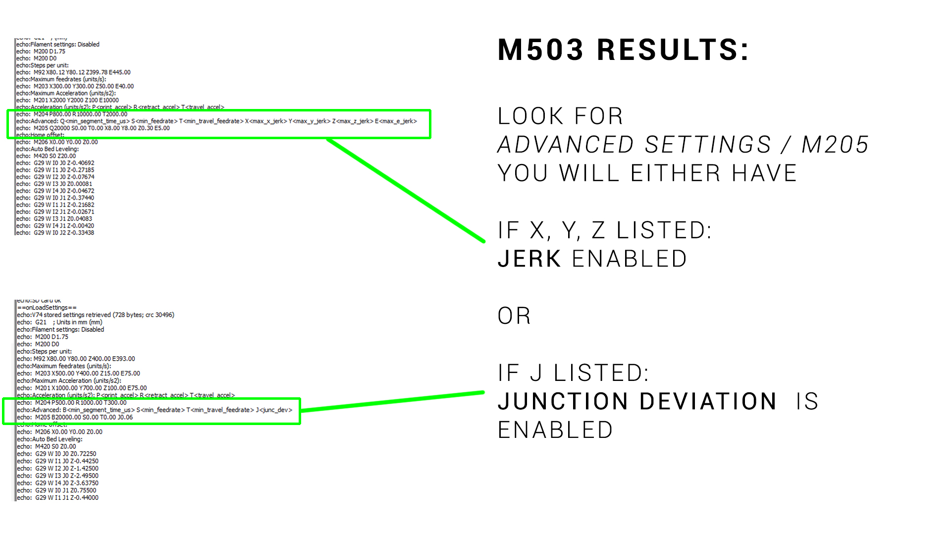 The only thing you need to know before this test is whether your firmware is set up for jerk (older) or junction deviation (newer). Entering M503 via terminal will give a list of printer variables: