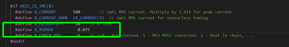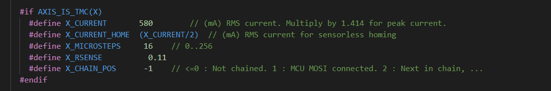 Therefore, you can set your RMS current directly in the firmware when compiling. This is X_CURRENT for the X axis, Y_CURRENT for the Y and so forth. After flashing firmware, remember that the previous value may still be stored in the EEPROM. Check your values by entering M503 in a terminal.